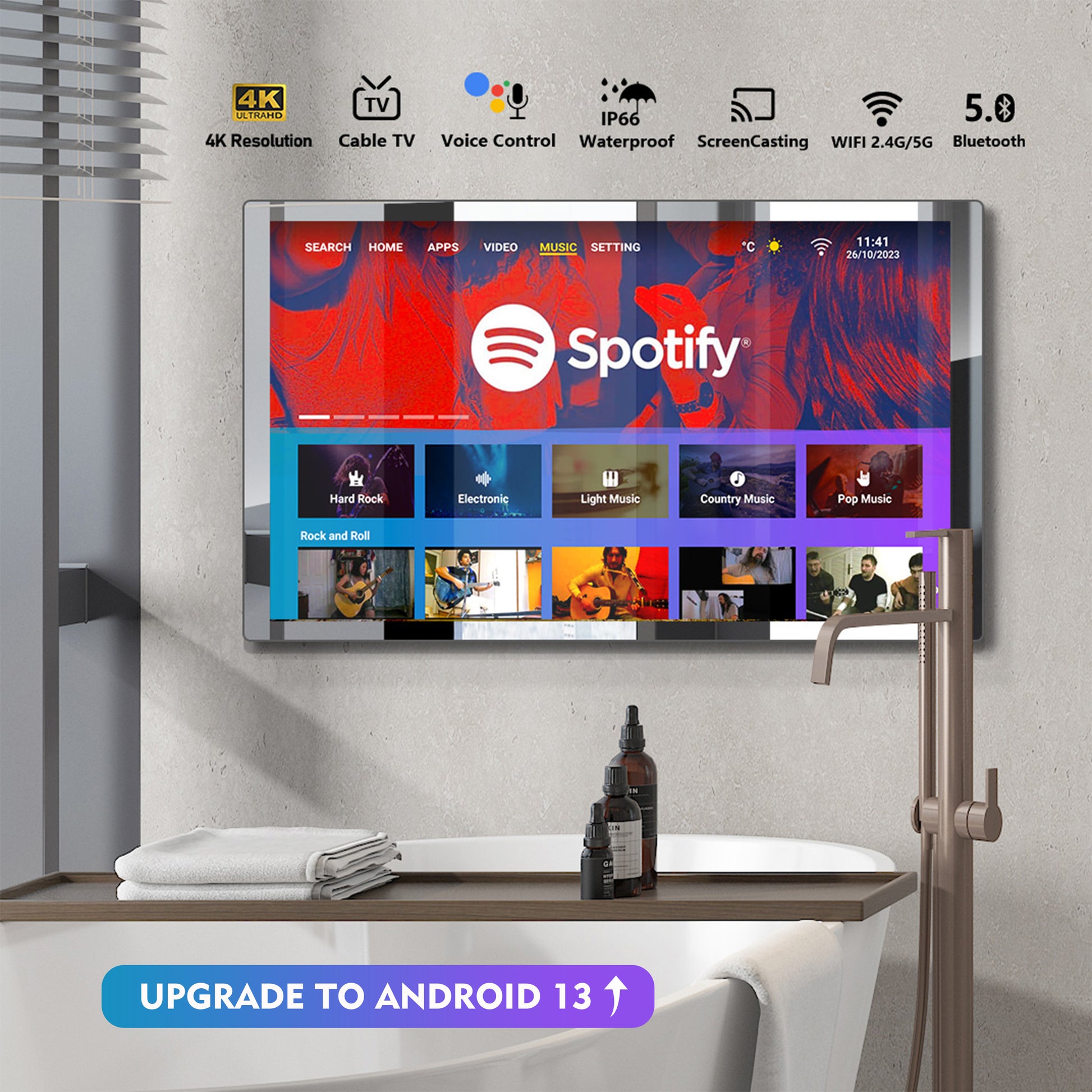 💦🛁🪞【Stylish 2-in-1 Vanishing Mirror Design】 Seamlessly integrate the TV into your bathroom decor with the innovative vanishing mirror design. This unique feature adds elegance and functionality to your space as the TV transforms from a mirror into a captivating display. With IP66 waterproof rating, it is protected against water damage in wet bathroom environments. Operated at a safe DC12V voltage for electrical safety and peace of mind.