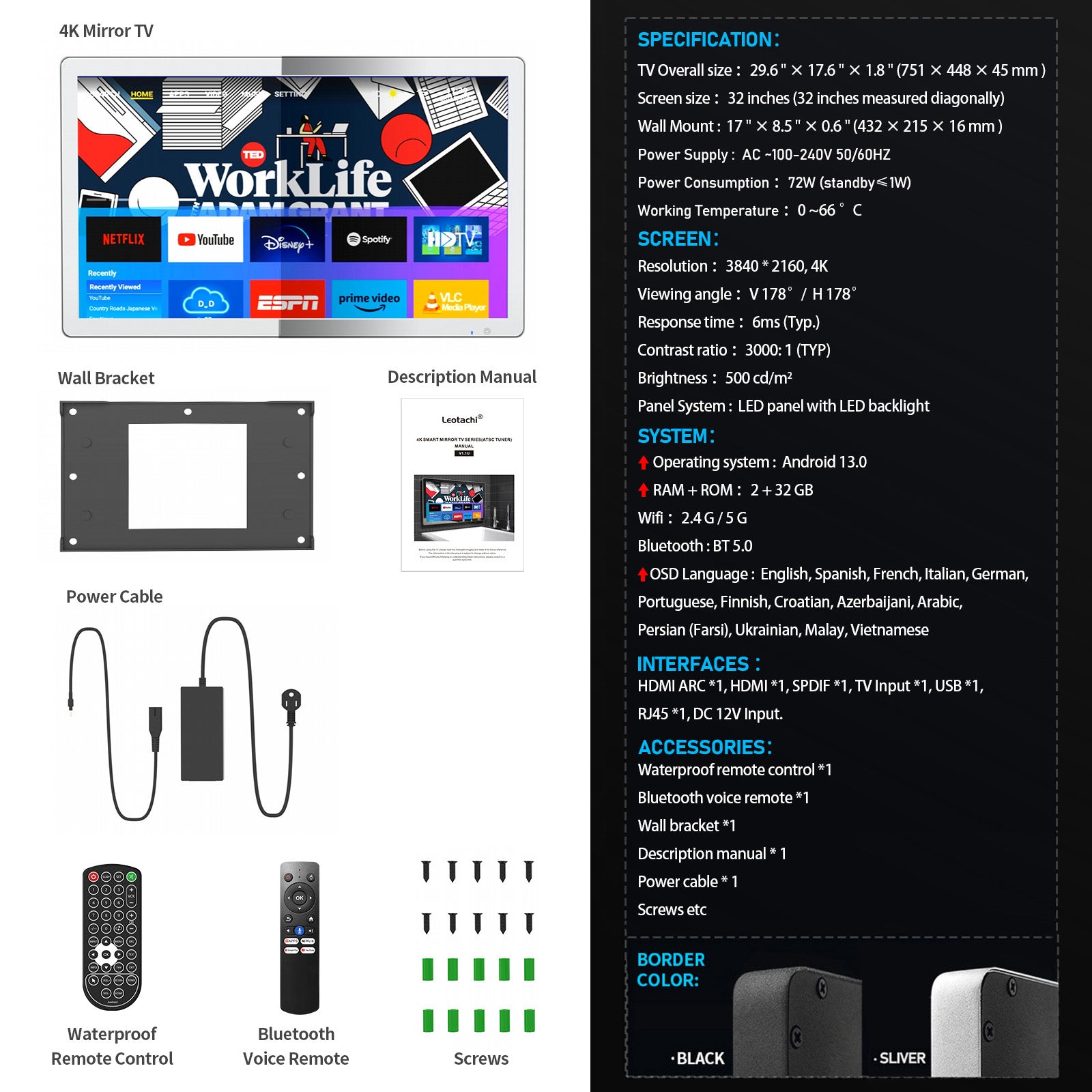 💦🛁🪞【Package Contents】 The package includes a 32-inch 4K Smart TV mirror, an IP68 waterproof remote, a Bluetooth remote, a DC12V adapter and plug, an embedded wall mount, and a manual. The TV features various interfaces for connectivity, including HDMI(ARC) *1, HDMI *1, SPDIF *1, TV *1, LAN *1, USB *1, and DC 12V *1. Please contact us if need any assistance, all received message will be replied within 24 hours. All our TVs come with 1 year warranty.